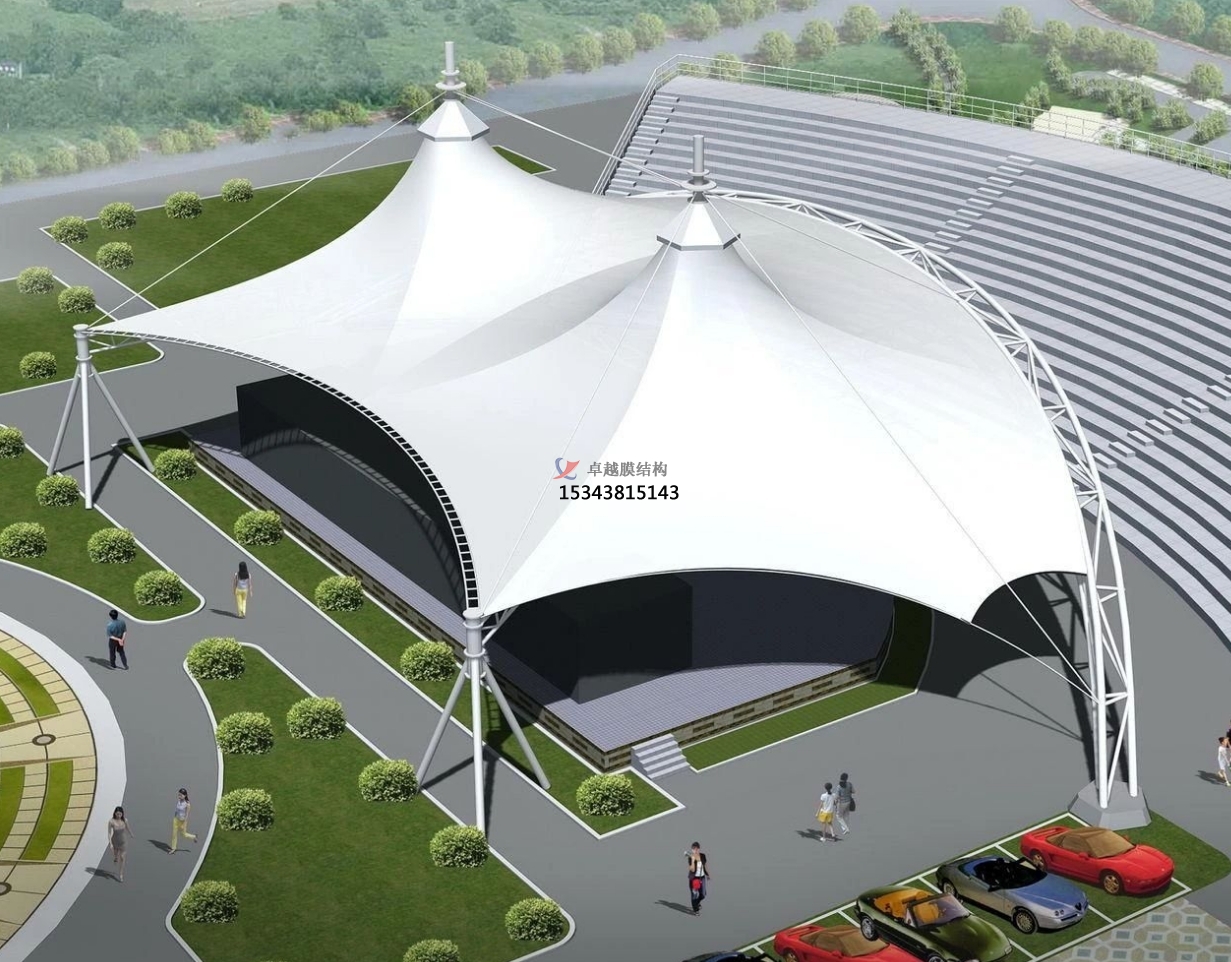 遮陽(yáng)與避雨:對(duì)于野外舞臺(tái)而言,遮陽(yáng)和避雨是非常重要的功能需求。膜結(jié)構(gòu)舞臺(tái)可以有用地阻撓陽(yáng)光直射和雨水侵襲,為藝人和觀眾供給一個(gè)舒適的環(huán)境。在酷熱的夏日,膜材可以阻撓部分紫外線(xiàn),下降舞臺(tái)區(qū)域的溫度,避免藝人因高溫中暑,一起也讓觀眾在觀看扮演時(shí)愈加舒適。在雨天,膜結(jié)構(gòu)可以避免雨水落在舞臺(tái)上,確保扮演設(shè)備不受損壞,藝人的扮演不受影響。