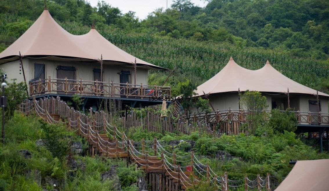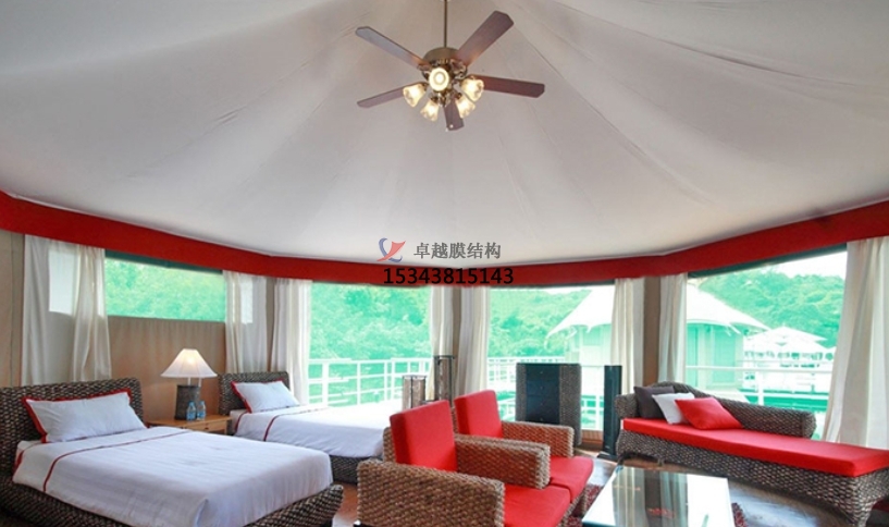 膜結(jié)構(gòu)帳篷酒店膜材是一種無毒的高分子材料。它具有無味的特點(diǎn),安裝后沒有一絲味道。另外,它擁有抗紫外線和反射光線極強(qiáng)的特點(diǎn),而且其抗撕裂的性能強(qiáng),還有B1/M2級(jí)別的阻燃性能,并且使用壽命極強(qiáng),一般壽命都在20年以上。
