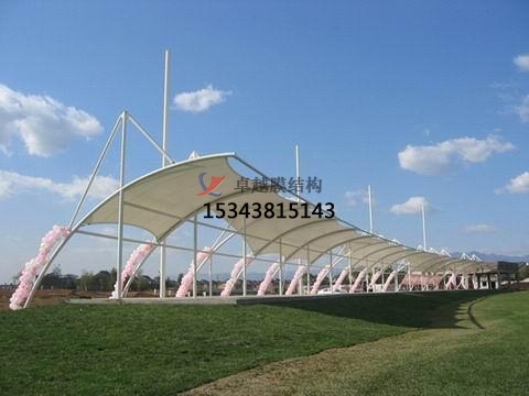 高爾夫球場膜結構景觀特點:高爾夫球場膜結構景觀具有輕質高強、造型多樣、透光性好、耐候性強、施工快捷、環(huán)保節(jié)能、功能復合、維護簡便等特點。高爾夫球場膜結構景觀采用高強度膜材,重量輕但承載能力出色,能以較小的自重覆蓋較大的跨度,減少支撐結構的需求,降低基礎建設成本,同時也減輕了對球場地面的壓力。膜材的柔性特質使其可以塑造出各種流線型、曲面等富有現(xiàn)代感的造型,如馬鞍形、傘形、帳篷形等,為高爾夫球場增添獨特的視覺效果,提升球場的整體美觀度和藝術氛圍。部分膜材的透光率可達20%-40%,白天可以充分利用自然采光,使球場內光線充足且柔和,減少人工照明的使用,降低能源消耗;夜晚燈光透射形成獨特的光影效果,為球場營造出浪漫而迷人的氛圍。其表面涂層具備抗紫外線、耐腐蝕、自潔等功能,能夠抵御陽光、風雨、冰雪等自然環(huán)境的侵蝕,適應戶外長期使用,可保持膜結構的性能和外觀長期穩(wěn)定,減少維護成本和頻率。膜結構的預制化程度高,大部分構件在工廠預制完成后,運輸?shù)浆F(xiàn)場進行安裝,安裝周期短,對球場的正常運營影響小,同時對基礎要求相對較低,可在較短時間內完成景觀建設。膜材料可回收利用,符合環(huán)保要求;其透光性和隔熱性能有助于減少白天照明能耗和空調負荷,還能配合光伏技術,進一步提高能源利用效率,實現(xiàn)節(jié)能減排。膜結構景觀不僅可以作為遮陽擋雨的設施,還能用于劃分球場空間、設置休息區(qū)、搭建看臺等,同時還具有藝術裝飾功能,提升球場的品質和檔次。其表面的自潔涂層使膜面在雨水沖刷下即可保持清潔,減少了清潔頻次,日常只需定期檢查膜材和支撐結構的狀況,如節(jié)點連接是否牢固、膜材是否有破損等,即可保障結構的安全穩(wěn)定。
