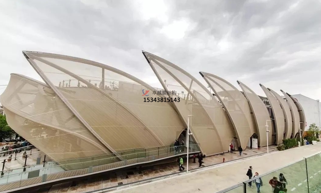 膜材是在聚酯纖維編織成的基布上涂敷PVC(聚氯乙烯)樹脂而形成的復(fù)合材料,非常的具有技術(shù)含量,其曲面可以隨著建筑師的設(shè)計(jì)需要任意變化,結(jié)合整體環(huán)境,建造出標(biāo)志性的形象工程。