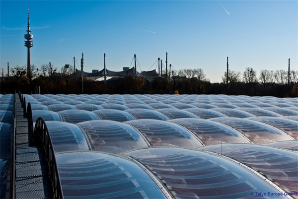 卓越的透光性 – ETFE薄膜可以高度透明,并允許紫外線通過,紫外線負(fù)責(zé)促進(jìn)光合作用,從而促進(jìn)植物生長。太陽能控制/遮陽 – ETFE薄膜系統(tǒng)可在一層或多層上加入多種玻璃料圖案,以改變其太陽能性能。箔片印有各種標(biāo)準(zhǔn)或定制圖案。顏色可以通過各種方式引入,無論它是在薄膜擠出過程中應(yīng)用,提供從紅色到紫色的各種色調(diào)的一致色調(diào),或添加無限顏色選項的照明。彈性 – 雖然ETFE薄膜非常有彈性,但它們?nèi)跃哂薪Y(jié)構(gòu)抗性。彈性/塑性極限的拉伸強(qiáng)度為21-23N /mm 2,但斷裂點的拉伸強(qiáng)度為52/Nmm 2。對于膜結(jié)構(gòu)計算,通常保守地采用15 N /mm的極限。持久耐用 – 長期暴露于環(huán)境污染,紫外線,刺激性化學(xué)品或極端溫度變化,ETFE不會降解。聲學(xué) – ETFE薄膜具有大約70%的聲學(xué)傳輸可持續(xù)/節(jié)能 – 從薄膜的擠出到運輸?shù)浆F(xiàn)場,與其他類似的包覆材料相比,消耗的能量很少,從而減少了整體碳足跡。除此之外,產(chǎn)品的性質(zhì)通過隔熱和采光增強(qiáng)了建筑物理,從而有助于建筑的全球低能耗。成本效益 – 由于ETFE的輕質(zhì)特性,可以更有效地設(shè)計下部結(jié)構(gòu)支撐系統(tǒng)和混凝土基礎(chǔ)。ETFE系統(tǒng)還提供充足的自然采光,從而通過降低對室內(nèi)照明的需求來更小化能源成本。可回收 – 易于回收利用,來自制造過程的廢棄物甚至舊的ETFE元件可以重新制成新的ETFE產(chǎn)品,如管道部件,電線或鑄件。
