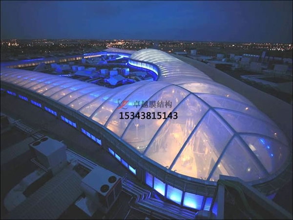 ETFE是乙烯和聚四氟乙烯的共聚物,屬結(jié)晶性高聚物。這種材料具有高強(qiáng)度、耐腐蝕、耐老化、化學(xué)穩(wěn)定性好等突出特點(diǎn)。人們將ETFE材料壓制成很薄的膜,這種膜材不僅具有很高的強(qiáng)度,而且是透明的蒸汽透過(guò)率很低,因而可將兩層膜復(fù)合到一起,中間充入空氣形成氣枕,包裹在建筑物外表面,便形成了一種具有高保溫性能的透明輕質(zhì)的建筑圍護(hù)結(jié)構(gòu)。尤其對(duì)于大跨度封閉式建筑,是一種很好的屋面和墻面圍護(hù)結(jié)構(gòu)材料。