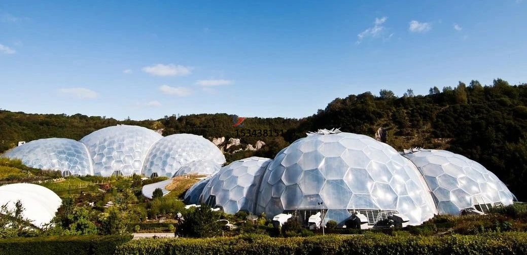“伊甸園”項(xiàng)目位于英國(guó)的康沃爾郡,是在廢棄的礦山上建的全球最大的生態(tài)溫室。主要由8個(gè)充滿未來(lái)主義色彩的巨大蜂巢式穹頂建筑構(gòu)成,其中每4座穹頂狀建筑連成一組。“伊甸園”的穹頂穹頂架由鋼管構(gòu)成,拼成尺寸9米大小的六角形天窗,天窗中間鋪設(shè)半透明的ETFE薄膜材料。在形態(tài)上像放大了無(wú)數(shù)倍的“大水泡”。"大水泡"里培育著原產(chǎn)于非洲、亞洲、歐洲、大洋洲和美洲的熱帶植物。