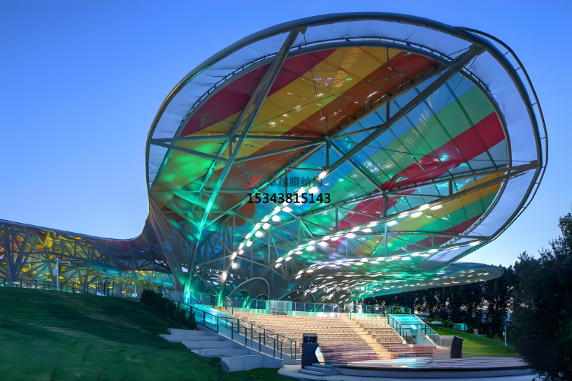 為使蝴蝶造型及色彩的視覺效果更加生動(dòng)形象,劇場屋面采用了ETFE彩色膜結(jié)構(gòu)。選用6種不同顏色的膜材進(jìn)行拼接。包括深紅、深綠、橙色、藍(lán)色、紅色、綠色6種色彩,其膜結(jié)構(gòu)展開面積近6000m2,最大膜單元面積超過309 m2。與常規(guī)涂裝不同,媯汭劇場這只“彩蝶”的鮮艷色彩不會(huì)因時(shí)間推移和風(fēng)霜雨雪褪色,而是會(huì)始終鮮亮如初。