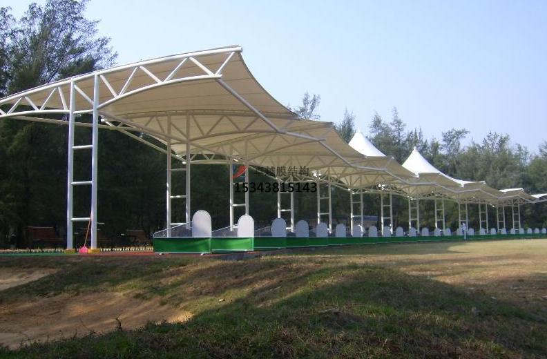 高爾夫球場綠草如茵青山環(huán)繞的整體環(huán)境,時尚又環(huán)保的配套設施才能更加提升其高貴品質。膜結構因適用廣,技術性及藝術性兼?zhèn)?,用來建設高爾夫球場發(fā)球臺再合適不過,潔白的膜材及獨特的造型搭配,此外,因張拉膜具有自重輕的特性,使其外表看起來輕盈簡約,讓前來運動的人們耳目一新,卸下平日工作壓力帶來的那份沉重,盡情享受身體與心靈的放松,何樂而不為呢?