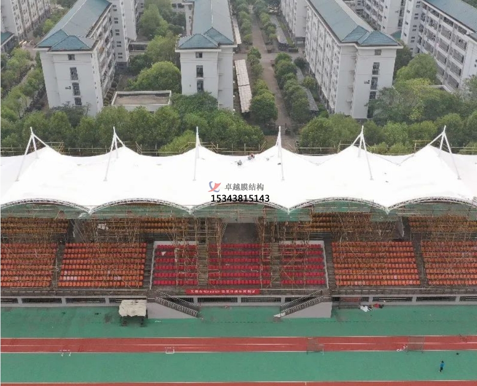 膜結(jié)構(gòu)體育看臺(tái)是以高強(qiáng)度柔性薄膜材料(如ETFE、PTFE、PVDF等)為覆蓋層,通過(guò)鋼索、鋼結(jié)構(gòu)框架或張力系統(tǒng)形成預(yù)張應(yīng)力空間結(jié)構(gòu)的建筑形式24。其設(shè)計(jì)融合建筑力學(xué)與材料科技,既能實(shí)現(xiàn)大跨度無(wú)柱懸挑,又能塑造流線型外觀,滿足體育場(chǎng)館寬視野、低荷載的建造需求。