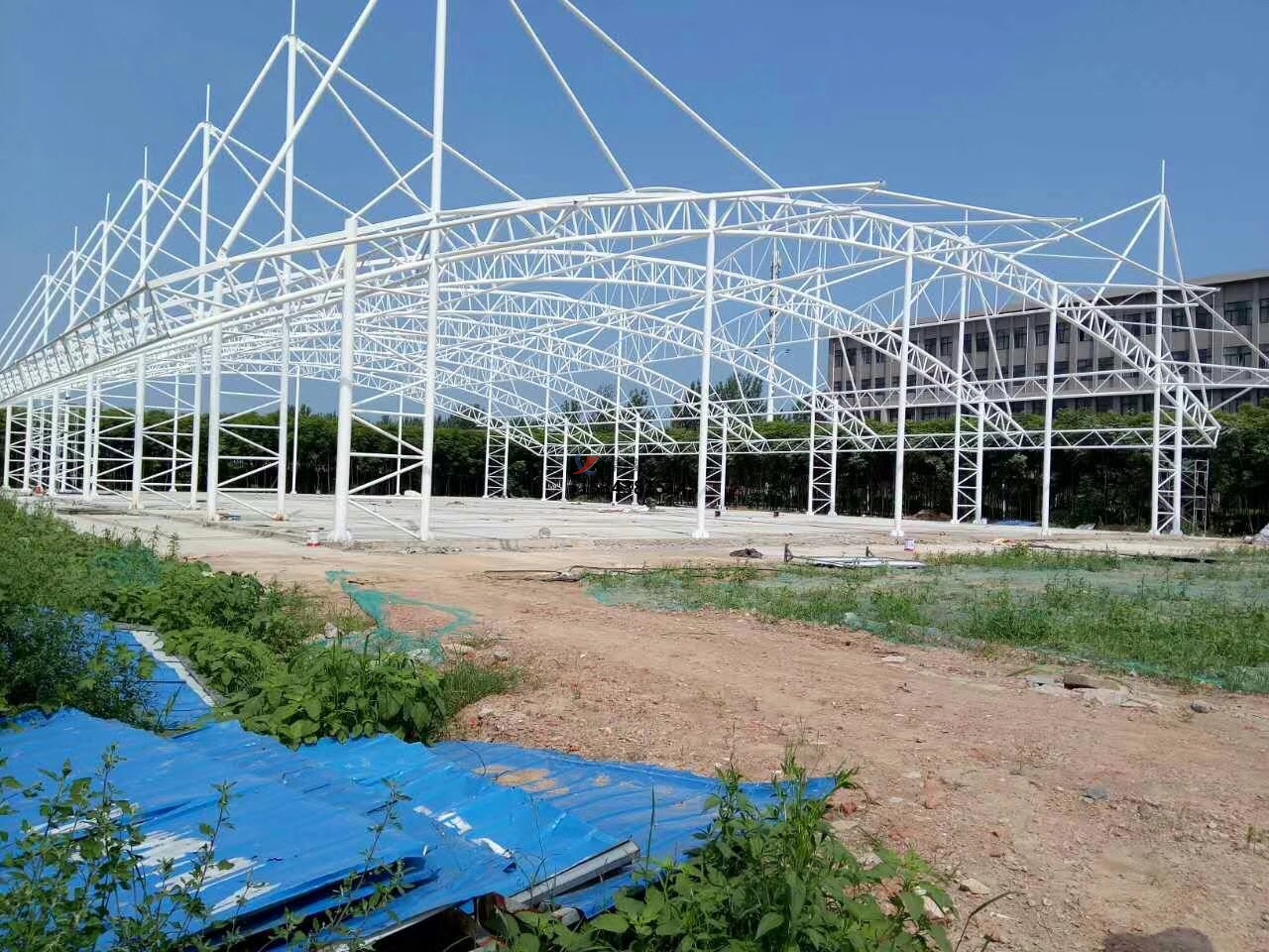 籃球場膜結構工程施工流程與關鍵技術:其流程包含支撐結構安裝(以鋼結構為例)、膜材加工與安裝、 膜面張拉與調整、節(jié)點處理與防水密封。在關鍵技術點中,支撐結構的安裝涵蓋構件吊裝,按施工順序吊裝鋼柱、鋼梁,使用經緯儀和水準儀控制垂直度和標高,臨時固定后進行焊接或螺栓連接。焊工需持證上崗,焊接前清理焊口,采用多層多道焊,焊后進行焊縫探傷檢測(如超聲波檢測),確保焊接質量。焊接部位及損傷的防腐層需重新涂刷防銹漆和面漆,涂層厚度符合設計要求。膜材加工與安裝,膜材的加工需要根據深化設計圖紙,在工廠內對膜材進行裁剪、熱合(或縫合),形成完整的膜單元。加工完成后進行預拼裝(預張力測試),檢查膜面尺寸、形狀是否符合設計要求,記錄膜材的張拉方向和定位標記。然后進行膜材吊裝,采用多點吊裝法,使用專用吊具(如尼龍吊帶)避免膜材損傷,吊裝過程中需專人指揮,確保膜面平穩(wěn)展開。先將膜材邊緣與支撐結構上的夾具臨時固定,再逐步張拉至設計位置。在膜面張拉與調整中,首先注意張拉順序,遵循 “由中間向四周” 或 “對稱張拉” 原則,分階段逐步施加預張力,避免膜面局部應力集中。然后是張力控制,使用張力計實時監(jiān)測膜面張力值,達到設計張力值的80%后暫停張拉,靜置24小時讓膜材應力松弛,再進行二次張拉至設計值。最后是形態(tài)調整,張拉過程中觀察膜面是否平整,有無褶皺或積水隱患,通過調整支撐結構的位移或夾具位置優(yōu)化膜面形態(tài)。在節(jié)點處理與防水密封中,膜材與鋼結構連接采用夾具固定(如鋁合金夾具),螺栓間距控制在200-300mm,確保連接牢固。膜材之間的拼接縫采用熱合焊接,焊縫寬度不小于50mm,焊接后進行氣密性檢測。最后進行防水處理,在膜結構邊緣與建筑主體連接處設置防水卷材或密封膠,防止雨水滲漏。排水坡度需≥5%,確保膜面雨水能迅速排至天溝或地漏。