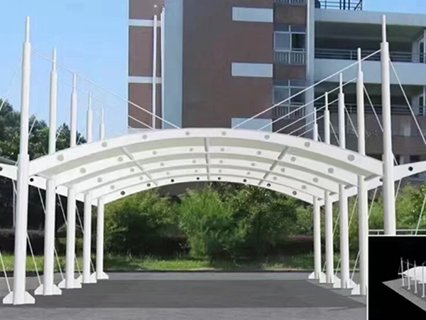 膜結構車棚的安裝包括膜體展開、連接固定和張拉成形三個部分。除了一般雨蓬不可比擬的耐用、實用、遮風擋雨的功能外,膜結構雨蓬更是一座雕塑,一件藝術品,給人一種美的視覺享受。