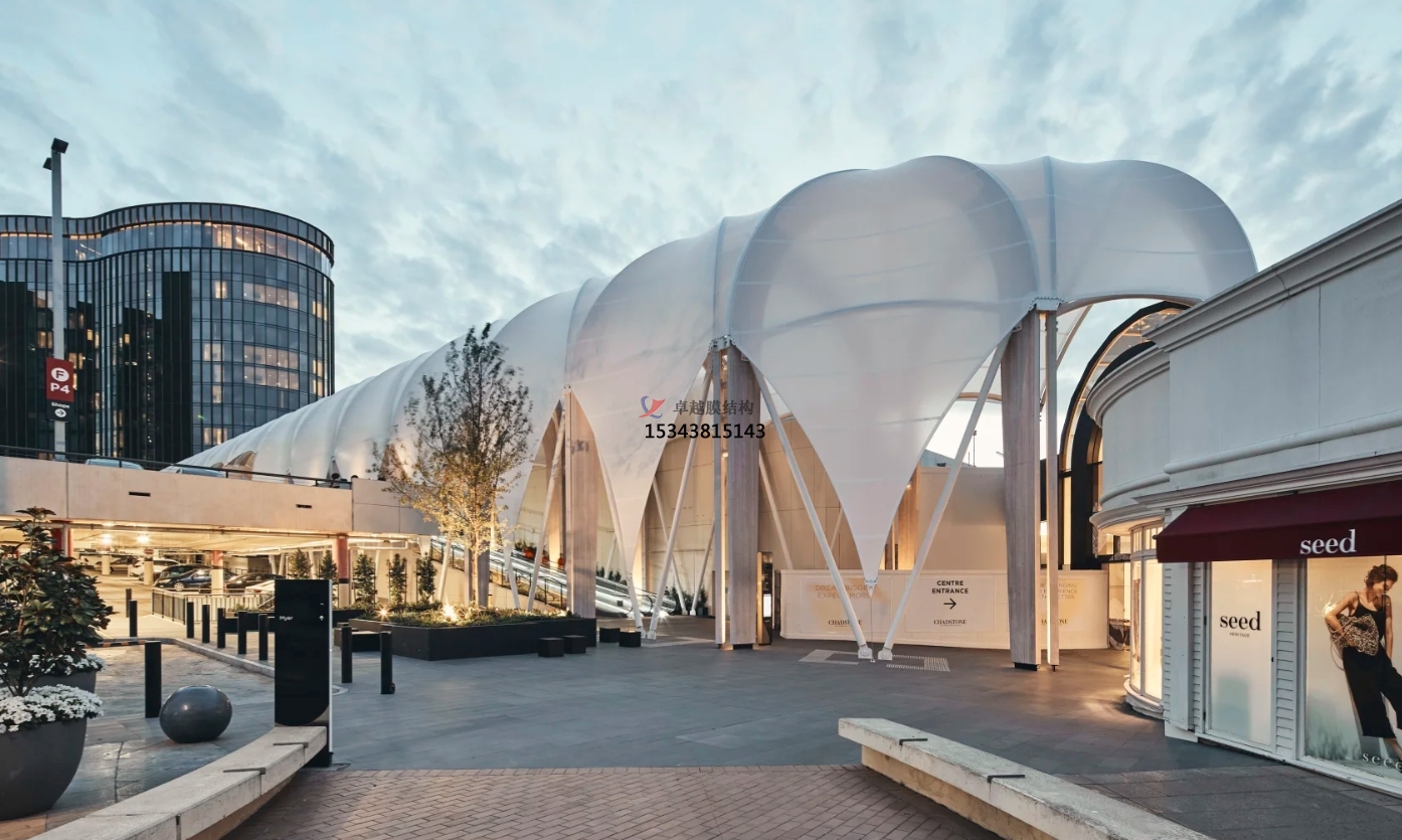 商業(yè)購(gòu)物中心的主要特點(diǎn)是因商業(yè)店鋪的集中而形成了室內(nèi)室外購(gòu)物、休閑、餐飲等功能空間,步行街及中央活動(dòng)區(qū)域是人們行走、休息、交流的開(kāi)放空間,基于商業(yè)街特色,就決定了所有設(shè)計(jì)的核心就是讓空間更具人性化。屋頂作為建筑附加設(shè)施,不僅要求遮陽(yáng)避雨的實(shí)用功能,也應(yīng)該是錦上添花的設(shè)施。目前國(guó)內(nèi)外膜結(jié)構(gòu)應(yīng)用于商業(yè)綜合體的工程案例越來(lái)越多,膜結(jié)構(gòu)建造的屋頂擁有很多傳統(tǒng)屋頂所不具備的優(yōu)勢(shì)特點(diǎn)。