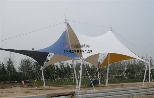 張拉膜景觀立柱底腳選用10mm厚鋼板與預埋件結實焊接,在裝置張拉膜景觀的時分將預埋件用混凝土澆筑后,用螺栓與立銜接,抗風系數高,添加張拉膜景觀全體結實程度,能反抗12級以上颶風來襲4、張拉膜景觀內部選用Φ38鍍鋅圓管與張拉膜景觀結構焊接,加強棚頂部強度,可讓棚內感覺寬闊亮堂,??寇囕v輕松便利,完全符合張拉膜景觀制造要求標準。