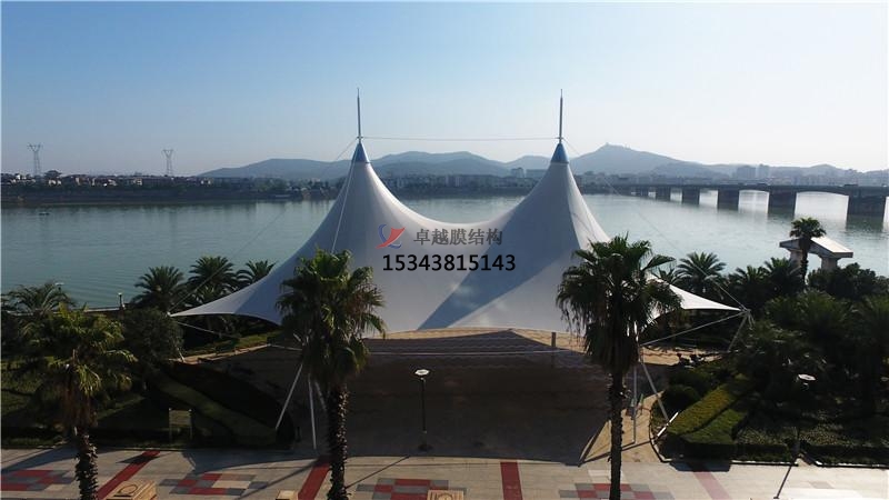 光學性能:膜材分為全遮光膜材和透光膜材、高透光膜材多種。這些膜材料均可濾除絕大部分紫外線,透光膜材對自然光的透射率在15-50之間,透射光在結構內部產生均勻的漫射光,無陰影,無眩光,具有良好的顯色性,夜晚在周圍環(huán)境光和內部照明的共同作用下,景觀膜結構遮陽棚表面發(fā)出自然柔和的光輝。