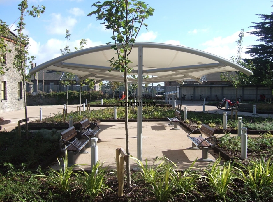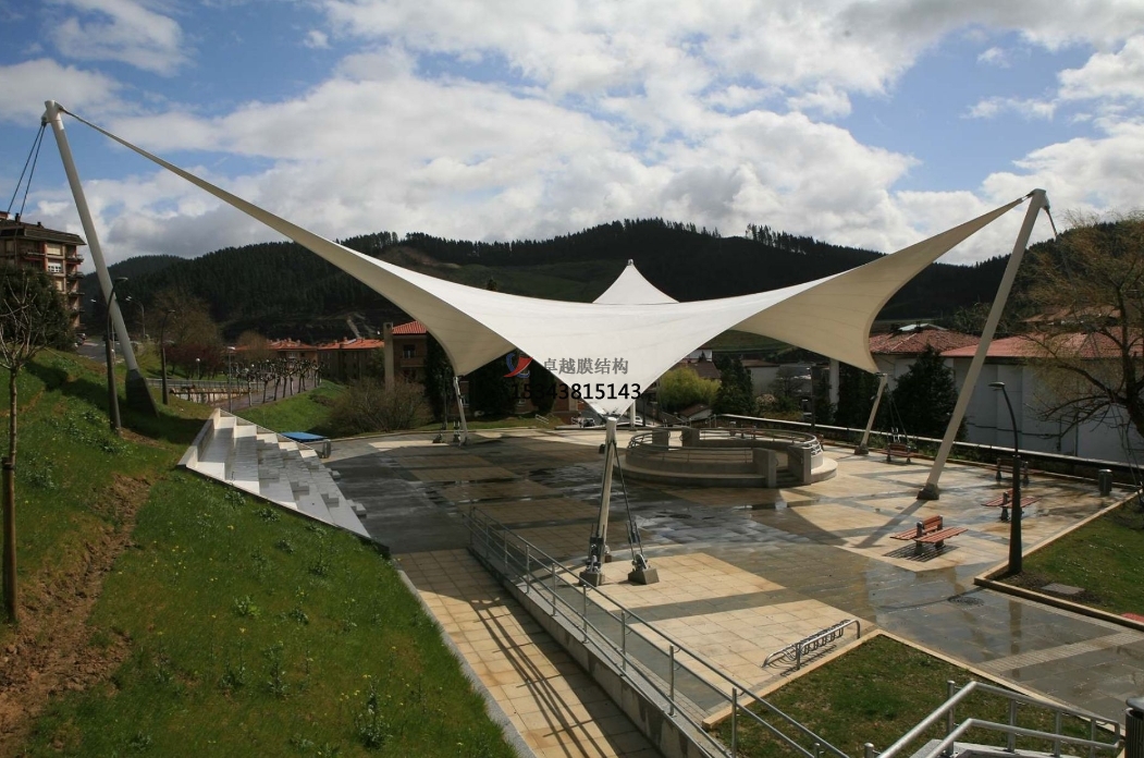 遮陽與擋雨:在戶外公共空間中,景觀膜結(jié)構(gòu)常被用作遮陽篷、雨篷或涼亭,為游客提供舒適的休憩環(huán)境。其大跨度的設(shè)計(jì)能夠覆蓋較大的區(qū)域,滿足不同天氣條件下的使用需求。