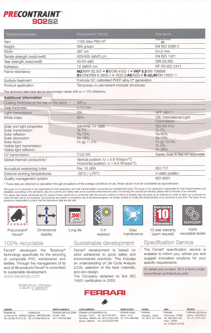 法拉利膜材十多年來,法拉利(PVDF)表面處理的復(fù)合膜材被應(yīng)用在全世界重要的織物建筑工程中?,F(xiàn)在,第代膜材再次確認(rèn)了這一出眾材料性能的更新發(fā)展。法拉利研發(fā)了第代材料正是為了滿足建筑師和業(yè)主在新世紀(jì)之初對(duì)于織物建筑提出的要求。這一 全新的膜材得益于更新的科研技術(shù),即將PVDF和硬化介體完美地結(jié)合。這種特殊的結(jié)合明顯地提高了材料的機(jī)械強(qiáng)度、使用壽命,并能長(zhǎng)期保持織物建筑的原始 美觀。第代膜材在積累了10多年的經(jīng)驗(yàn)的基礎(chǔ)上,可以提供專業(yè)保證。法拉利現(xiàn)在能夠根據(jù)要求和每個(gè)項(xiàng)目的具體情況,提供12年質(zhì)量保證 (PRECONTRAINT702除外)。
