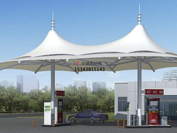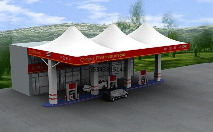 尖頂加油站張拉膜結(jié)構(gòu)效果圖展,常見的加油站張拉膜結(jié)構(gòu)是尖頂?shù)木佣?,白色pvc材質(zhì)的膜也是居多,看上去干凈整潔,而且是阻燃材料,防火,防潮,使用周期久,易于護理和維護,也是成為眾多加油站的不二之選。