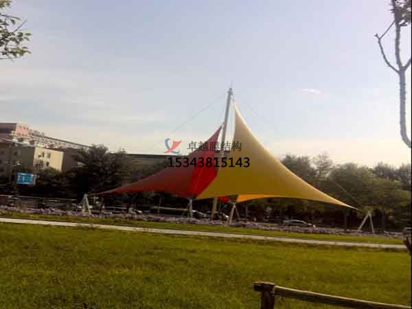 園林膜結構施工時間短,人工耗費相對少很多,天氣好耗材量也降低,整體膜結構預算可以在保障工程質量的前提下實惠不少。膜結構是依靠膜自身的張拉應力與支撐桿和拉索共同構成機構體系。通過改變形狀來分散荷載,從而獲得更小內力增長,形成自由的曲面形態(tài)。