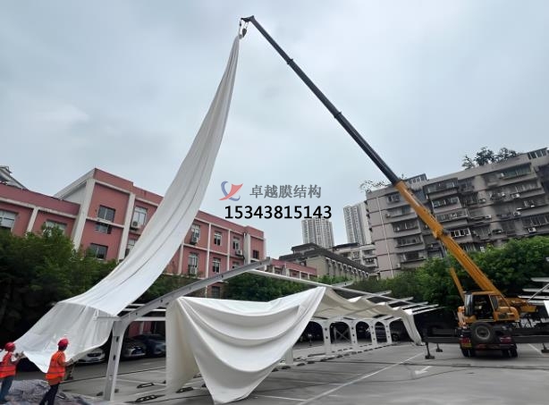 安裝過(guò)程:安裝過(guò)程分別是鋼結(jié)構(gòu)的安裝,膜材的安裝和附件安裝。鋼結(jié)構(gòu)的安裝會(huì)根據(jù)設(shè)計(jì)要求進(jìn)行鋼結(jié)構(gòu)基礎(chǔ)的施工,確保基礎(chǔ)的尺寸、位置、標(biāo)高符合設(shè)計(jì)要求,做到表面光滑、無(wú)變形、無(wú)損傷。鋼結(jié)構(gòu)的安裝位置必須準(zhǔn)確,將鋼結(jié)構(gòu)構(gòu)件在地面進(jìn)行預(yù)組裝,檢查各構(gòu)件的連接是否準(zhǔn)確、牢固,使用專(zhuān)業(yè)的吊裝設(shè)備,如起重機(jī)等,按照預(yù)定的吊裝方案進(jìn)行操作,確保鋼結(jié)構(gòu)的安裝位置準(zhǔn)確。要隨時(shí)進(jìn)行測(cè)量和調(diào)整,保證鋼結(jié)構(gòu)的垂直度、水平度和跨度等符合設(shè)計(jì)要求。采用焊接、螺栓連接等方式將鋼結(jié)構(gòu)構(gòu)件連接固定,確保連接的強(qiáng)度和可靠性。焊接時(shí),要嚴(yán)格控制焊接質(zhì)量,避免出現(xiàn)焊接缺陷。膜材的安裝過(guò)程,膜面的尺寸和形狀必須符合設(shè)計(jì)要求,表面干凈、無(wú)損傷。膜材在安裝現(xiàn)場(chǎng)按照預(yù)定的方向和位置展開(kāi),同時(shí)應(yīng)注意避免膜材與地面或其他物體摩擦、劃傷。使用專(zhuān)用的夾具或繩索將膜材固定在鋼結(jié)構(gòu)上,初步調(diào)整膜材的位置,使其與鋼結(jié)構(gòu)的連接點(diǎn)對(duì)齊。進(jìn)行逐步且均衡的膜面張拉,張拉過(guò)程要均勻、緩慢地進(jìn)行,施加適當(dāng)?shù)念A(yù)張力,同時(shí)要根據(jù)膜材的實(shí)際情況,對(duì)張拉力進(jìn)行適當(dāng)?shù)恼{(diào)整,保證膜材表面平整、光滑,無(wú)褶皺、松弛等現(xiàn)象,使其達(dá)到設(shè)計(jì)要求。在膜材張拉到位后,使用專(zhuān)用的固定件將膜材牢固地固定在鋼結(jié)構(gòu)上。固定件的間距和安裝方式要符合設(shè)計(jì)要求,確保膜材在使用過(guò)程中不會(huì)出現(xiàn)松動(dòng)或位移。附件安裝,附件的安裝包括排水系統(tǒng)安裝,遮陽(yáng)設(shè)施安裝和安全設(shè)施安裝。安裝膜結(jié)構(gòu)的排水槽、落水口等排水設(shè)施,確保雨水能夠順利排出,避免在膜面形成積水。排水系統(tǒng)的安裝要保證密封性和排水順暢性。如果膜結(jié)構(gòu)設(shè)計(jì)有遮陽(yáng)要求,安裝相應(yīng)的遮陽(yáng)簾、遮陽(yáng)網(wǎng)等遮陽(yáng)設(shè)施。遮陽(yáng)設(shè)施的安裝要牢固可靠,能夠滿(mǎn)足遮陽(yáng)和使用功能的要求。安裝必要的安全設(shè)施,如欄桿、安全網(wǎng)等,確保人員在膜結(jié)構(gòu)區(qū)域內(nèi)的安全。