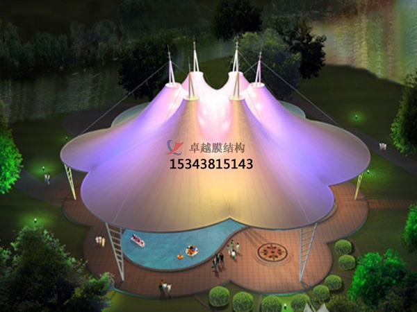 柔性材料具有透光和防紫外線功能,在一些室外建筑和環(huán)境小品中得到廣泛的應(yīng)用。正是由于這一特征,夜間的燈光設(shè)計(jì)使膜結(jié)構(gòu)具有鮮明的環(huán)境標(biāo)志特征。 優(yōu)美造型的膜材,不銹鋼配件和緊固件加上設(shè)計(jì)輕巧合理,表面處理嚴(yán)格的鋼結(jié)構(gòu)支撐,塑造出形式美觀,設(shè)計(jì)合理的膜結(jié)構(gòu),在當(dāng)今世界范圍內(nèi)的建筑環(huán)境設(shè)計(jì)中占有舉足輕重的地位。