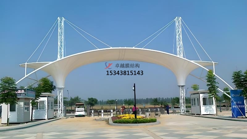 膜結(jié)構(gòu)出入口優(yōu)勢(shì)總結(jié):膜結(jié)構(gòu)的外觀和造型可以創(chuàng)造出各種獨(dú)特的造型,如弧形、波浪形、拱形等,使出入口具有較高的觀賞性和藝術(shù)感。膜材料通常具有較好的透光性,可以增加出入口的采光,使內(nèi)部空間更加明亮。膜結(jié)構(gòu)具備足夠的穩(wěn)定性和耐久性,以承受風(fēng)、雨、雪等自然環(huán)境的影響。由于出入口需要保證人員和車輛的安全通行,所以膜結(jié)構(gòu)具備防滑、防碰撞等安全設(shè)計(jì)??紤]到人們的使用需求,膜結(jié)構(gòu)通常具有人性化設(shè)計(jì),出入口的寬度、高度、坡度等符合人體工程學(xué)原理,方便人們進(jìn)出。通過適當(dāng)?shù)恼彰髟O(shè)計(jì),可以使膜結(jié)構(gòu)出入口在夜晚呈現(xiàn)出獨(dú)特的視覺效果,增加夜間的辨識(shí)度和美感。膜結(jié)構(gòu)出入口的設(shè)計(jì)多樣化,可以與周邊建筑和環(huán)境相協(xié)調(diào),融入整體景觀。膜結(jié)構(gòu)出入口的設(shè)計(jì)還可以結(jié)合具體的文化元素和現(xiàn)代感,如“城市之窗”造型、折紙?jiān)煨?、陶器造型等,使出入口不僅實(shí)用,還能成為城市景觀的一部分。