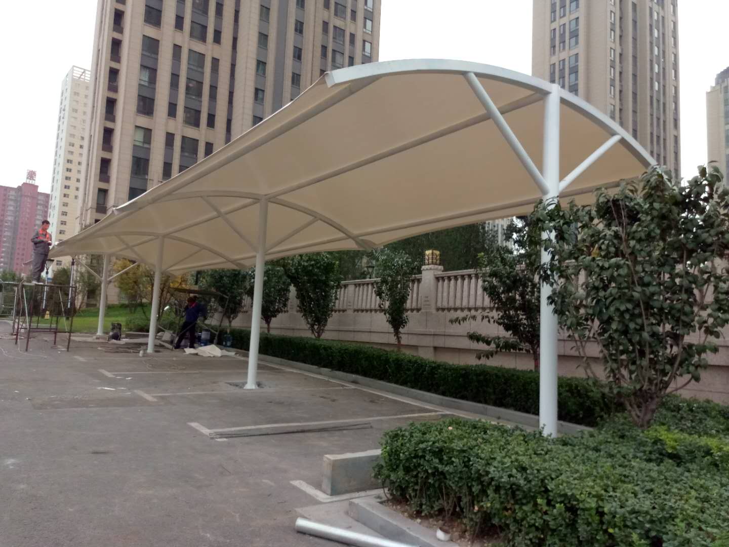 對(duì)現(xiàn)場(chǎng)進(jìn)行預(yù)埋處理。膜結(jié)構(gòu)結(jié)構(gòu)不需要地基,但需要埋預(yù)埋件,以便膜結(jié)構(gòu)結(jié)構(gòu)的安裝固定。加固預(yù)埋件可增強(qiáng)膜結(jié)構(gòu)的抗風(fēng)能力,高可抵御12級(jí)大風(fēng)。