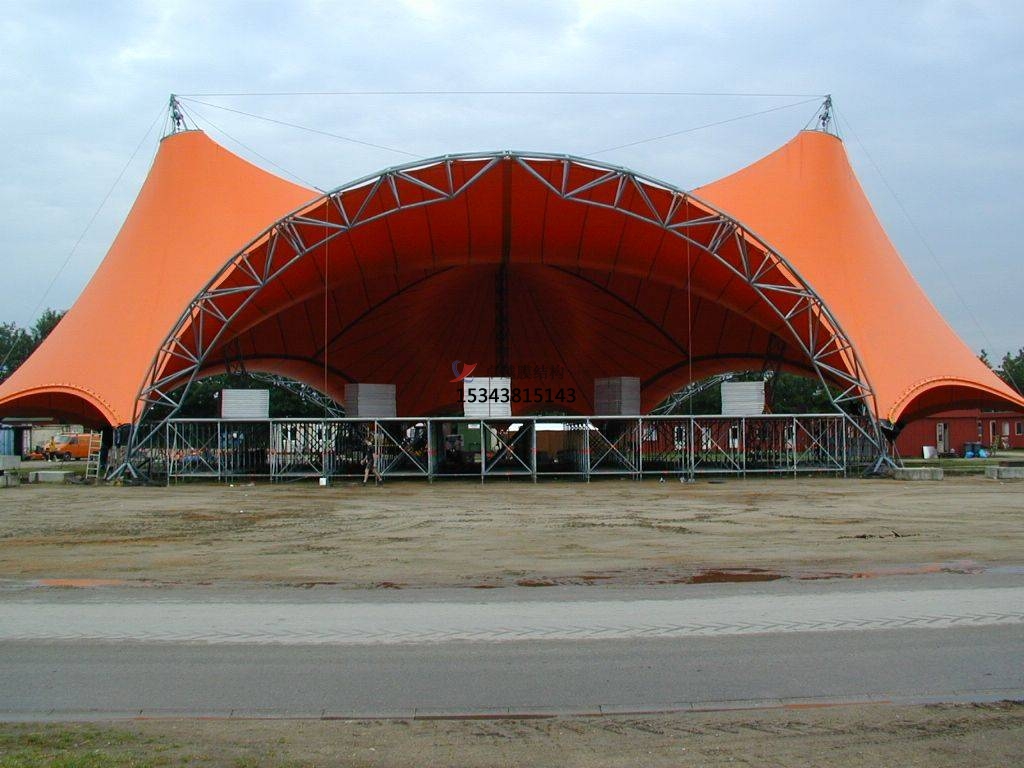 3、易于安裝和拆卸:膜結(jié)構(gòu)舞臺(tái)的安裝和拆卸非常方便,可以快速完成,并且對(duì)周?chē)h(huán)境的影響很小。