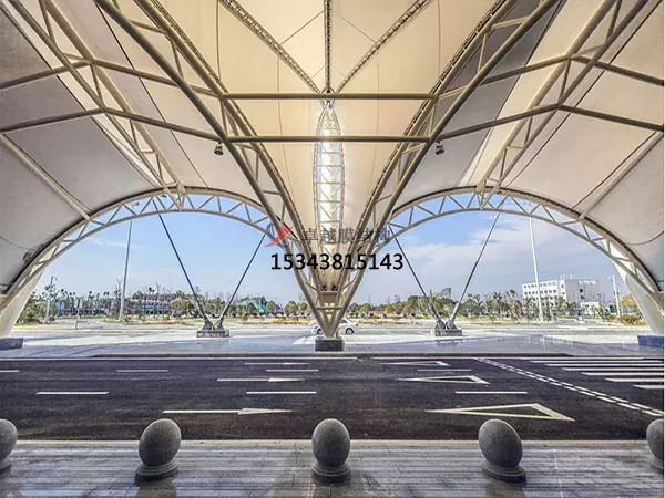 膜結(jié)構(gòu)遮陽(yáng)棚由立柱和頂棚構(gòu)成。立柱多由金屬合金制作,如鋼,鋁等,質(zhì)量輕且質(zhì)地硬,頂棚則是由膜結(jié)構(gòu)材料制成。