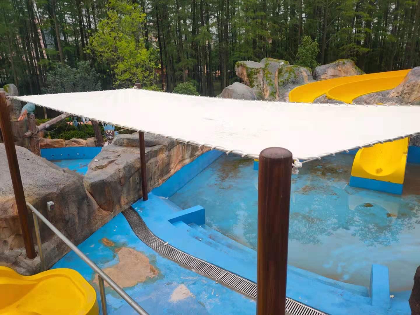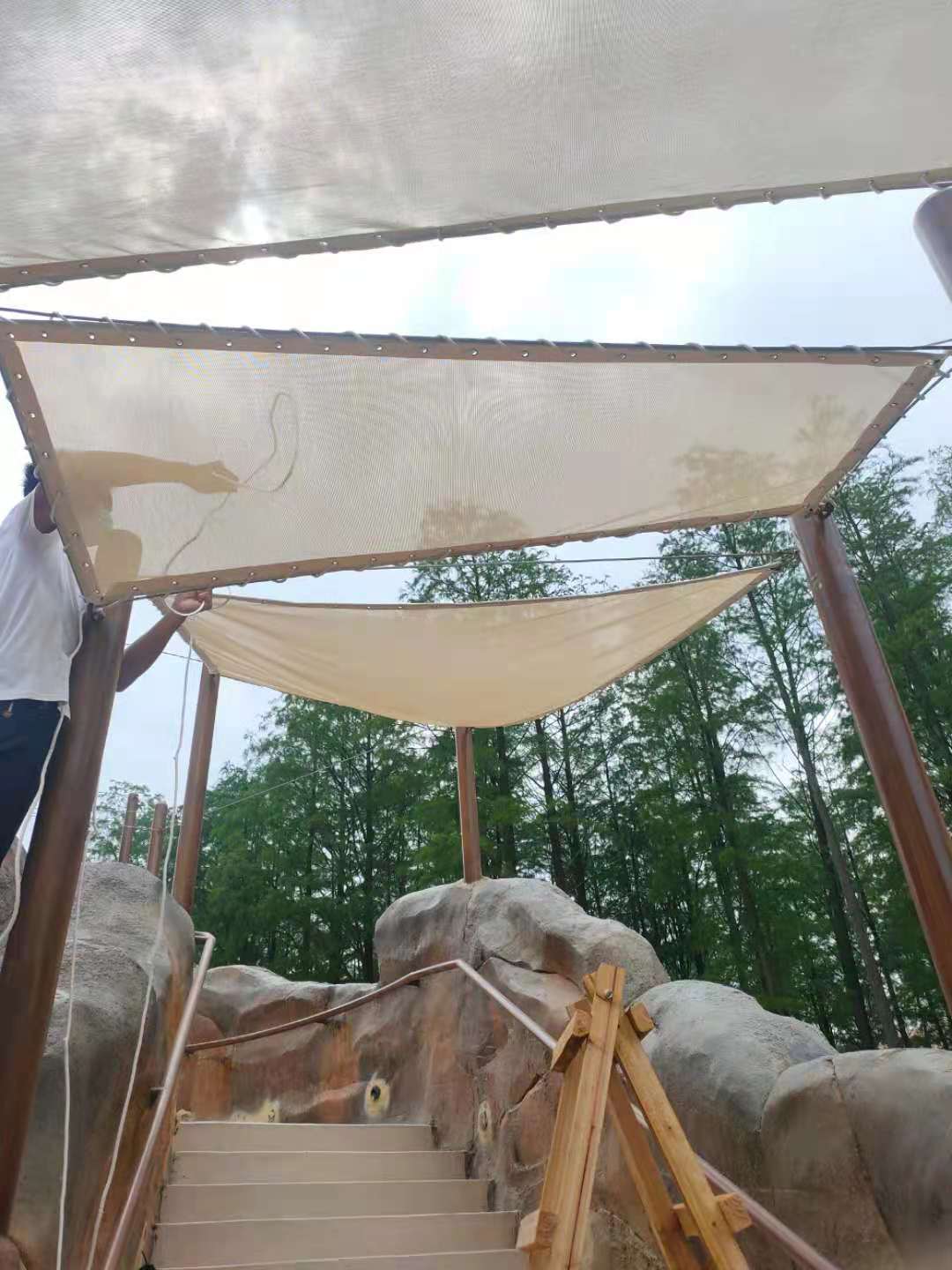 武漢瑪雅公園膜結(jié)構(gòu)景觀,是我公司與游樂(lè)設(shè)備公司配套工程,材料遮陽(yáng)效果好,質(zhì)量輕,采用法國(guó)進(jìn)口彩色法拉利網(wǎng)格膜材,空運(yùn)到我廠深加工后,現(xiàn)場(chǎng)安裝完成的,完工時(shí)間2021年4月7日