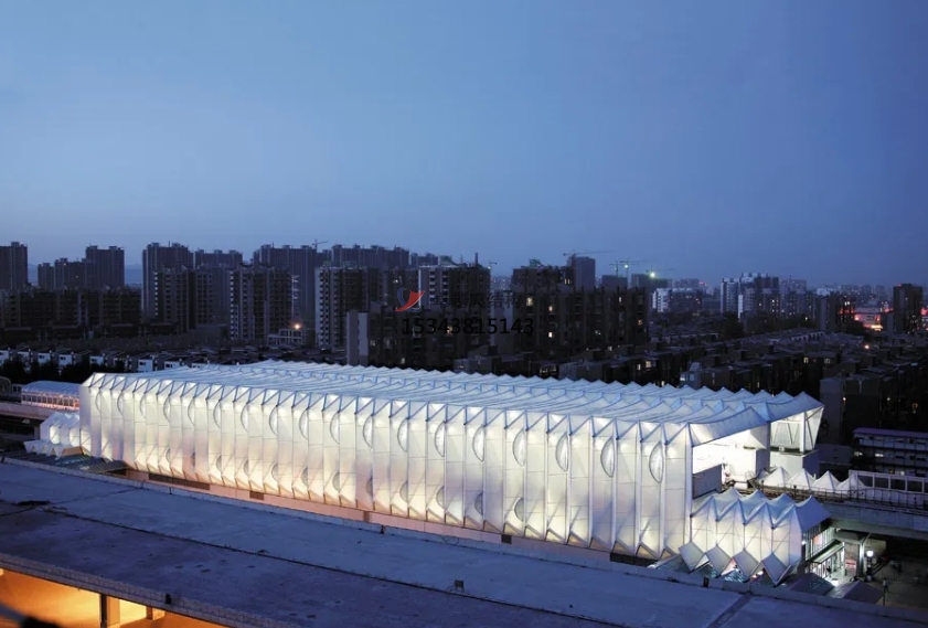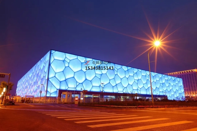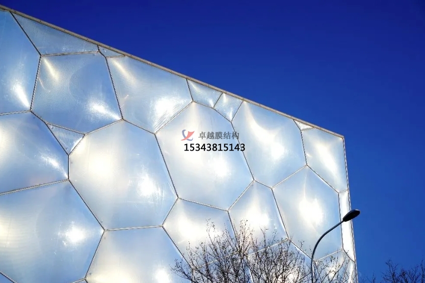 膜結(jié)構(gòu)使得建筑輕盈感十足,膜材料的良好透性使得建筑界面透光而不透視。由于該材料(ETFE)氣枕在陽光底下富有通透感光線可以通過漫射和折射進(jìn)入界面,讓膜結(jié)構(gòu)建筑呈現(xiàn)出朦朧夢(mèng)幻之美。