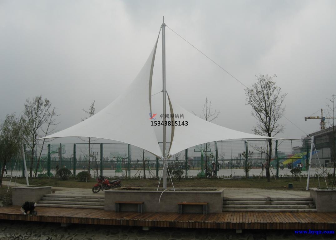 張拉膜景觀建筑的設(shè)計(jì)應(yīng)根據(jù)建筑的使用特點(diǎn)和總體布局要求,合理確定排水坡度和位置,保證膜面排水通暢;在積雪較重的地區(qū),應(yīng)采用較大的薄膜坡度和必要的防雪措施。