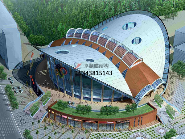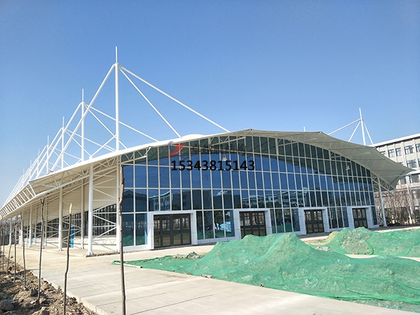場(chǎng)館看臺(tái)膜結(jié)構(gòu)特點(diǎn):其具有造型美觀、施工簡(jiǎn)便、透光性好、自潔性強(qiáng)、節(jié)能環(huán)保、適應(yīng)性強(qiáng)等特點(diǎn)。膜材料具有優(yōu)異的柔韌性和可塑性,能夠創(chuàng)造出豐富多彩的建筑造型,如貝殼形、弧形、錐形等,為場(chǎng)館增添獨(dú)特的藝術(shù)氛圍。膜結(jié)構(gòu)看臺(tái)的施工過(guò)程相對(duì)簡(jiǎn)單,不需要大型機(jī)械設(shè)備和腳手架等輔助工具。裁剪、拼接和安裝都可以在加工廠完成,現(xiàn)場(chǎng)只需進(jìn)行簡(jiǎn)單的張拉和錨固,可有效縮短施工周期。膜材具有良好的透光性,白天陽(yáng)光可以透過(guò)膜材形成漫射光,使膜覆蓋空間內(nèi)達(dá)到和室外幾乎一樣的自然效果,不僅能為觀眾提供舒適的觀賽環(huán)境,還能節(jié)省大量的照明能源。膜材表面光滑,灰塵、污垢等不易附著,在雨水的沖刷下可恢復(fù)其原有的清潔面層與透光性,大大減少了后期的清潔維護(hù)工作量。膜材料本身具有一定的隔熱性能,能有效阻擋太陽(yáng)輻射熱傳入室內(nèi),降低場(chǎng)館的空調(diào)能耗。同時(shí),其可回收再利用的特性也符合綠色環(huán)保的建筑理念。膜結(jié)構(gòu)看臺(tái)的設(shè)計(jì)可以根據(jù)不同的需求和場(chǎng)景進(jìn)行定制,適應(yīng)各種地形和環(huán)境,如山地、水域和不規(guī)則地形等。
