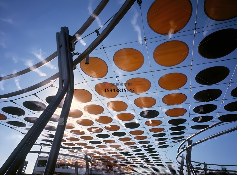 景觀膜結(jié)構(gòu)主要由膜材、骨架系統(tǒng)與支撐系統(tǒng)協(xié)同構(gòu)成。膜材作為核心部分,多選用聚酯纖維、聚氯乙烯等材料。聚酯纖維膜材強(qiáng)度高,能有效抵御外界拉力,保障結(jié)構(gòu)穩(wěn)固;聚氯乙烯膜材則具備良好的柔韌性與可塑性,可輕松塑造出各種復(fù)雜造型。同時(shí),這些膜材還擁有出色的耐久性,能經(jīng)受住長時(shí)間的風(fēng)吹日曬、雨水侵蝕,確保景觀膜結(jié)構(gòu)的長期使用。
