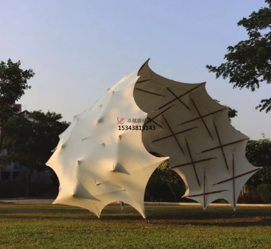 輕質(zhì)高強(qiáng),穩(wěn)固耐用:景觀膜結(jié)構(gòu)采用的高強(qiáng)度薄膜材料,重量僅約為傳統(tǒng)建筑結(jié)構(gòu)材料的十分之一,極大地減輕了自身重量。但 “輕量級” 的它卻有著超乎想象的強(qiáng)大實(shí)力,拉伸強(qiáng)度極高,在面對風(fēng)荷載與雪荷載時(shí),能憑借出色的韌性與剛性,展現(xiàn)卓越的穩(wěn)定性。在強(qiáng)風(fēng)天氣中,膜結(jié)構(gòu)可通過自身的柔性變形來緩沖風(fēng)力,避免因剛性抵抗而導(dǎo)致結(jié)構(gòu)損壞;面對積雪,其合理的造型與支撐設(shè)計(jì)能使積雪均勻分布或自然滑落,防止因積雪過重造成坍塌,為景觀設(shè)施提供可靠的安全保障。