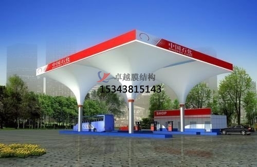 就拿加油站罩棚來說吧,傳統(tǒng)的罩棚一般是用無數(shù)根(只是想說數(shù)量大,別較真兒)鋼管組成的網(wǎng)架支撐起來的,沉重且易腐蝕,易褪色。膜結(jié)構(gòu)加油站則大膽地走起了“減肥”路線,省去了這些網(wǎng)架,采用型鋼結(jié)構(gòu),不僅輕便了,還延長了使用壽命,而且檐面采用的膜結(jié)構(gòu)復(fù)合材料,可保持10年不褪色。