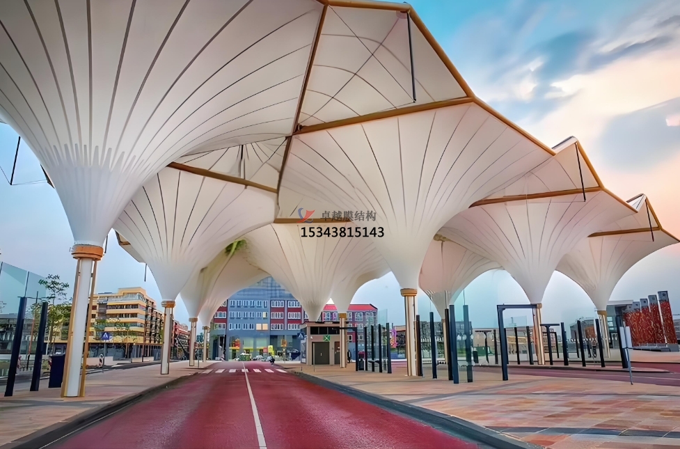 此外,PTFE膜結(jié)構(gòu)的薄膜具有一定的透光性,能夠有效利用自然光線,降低室內(nèi)照明能耗,能夠遮擋紫外線和紅外線,減少太陽(yáng)輻射對(duì)建筑內(nèi)部的熱負(fù)荷,實(shí)現(xiàn)能源的節(jié)約和環(huán)境的保護(hù);而且PTFE膜結(jié)構(gòu)能夠通過(guò)不同的張拉和固定方式,創(chuàng)造出各種形態(tài)的建筑設(shè)計(jì)。它可以形成曲線、弧線、折線等多樣化的形狀,滿足建筑師對(duì)于獨(dú)特外觀和創(chuàng)新設(shè)計(jì)的需求。