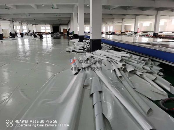 2、同一膜結構工程宜使用同一企業(yè)、同一批號的膜材。每批膜材均應具有產品質量保證書和檢查報告,并應進行進貨抽檢。膜材表面應無針孔,無明顯褶皺和明顯污漬,不應出現(xiàn)斷絲、裂縫和破損現(xiàn)象,色澤應無明顯差異。