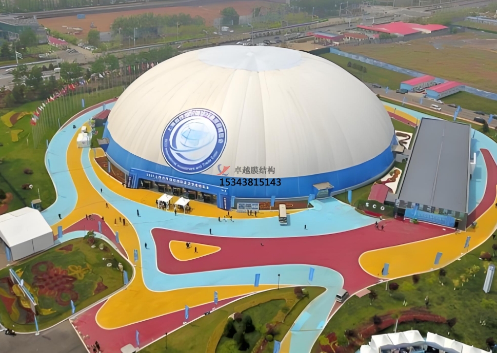 膜結構建筑膜材除了常用的白色之外,紅、黃、藍、綠也很受歡迎,還可根據場地定制不同色彩,兒童游樂場或水上樂園等場地用彩色膜結構打造相應設施再合適不過。