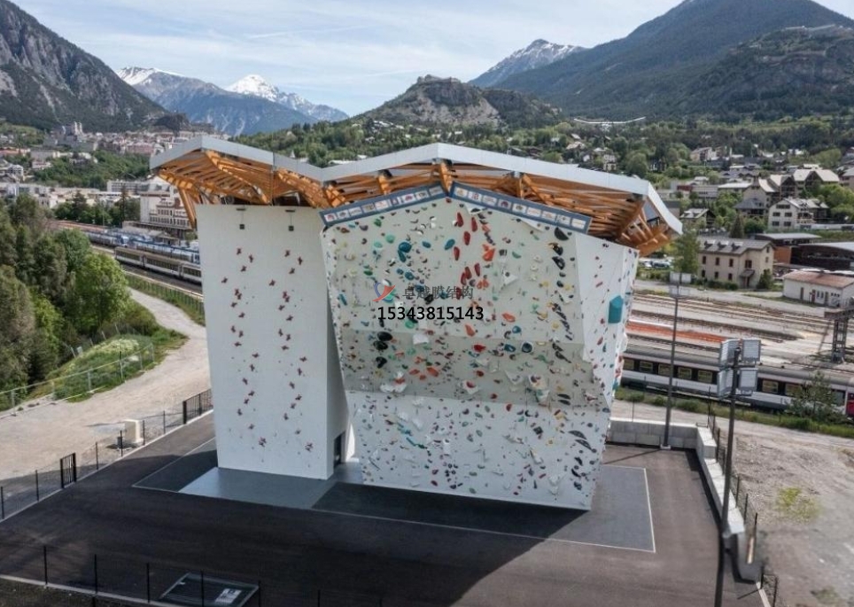 由建筑師Grégory Poles及其6B建筑事務所設計,這座攀巖塔提供了超過1000平方米的攀巖面積和130條線路,覆蓋了三大攀巖競賽項目——難度攀巖、速度攀巖和抱石攀巖。建筑以一根鋼支柱為核心,支撐著多個攀巖面,其頂部設有木質屋頂結構,并覆蓋法拉利STFE“軟玻璃”膜材。這一設計確保攀巖者無論天氣如何都能進行訓練和比賽。