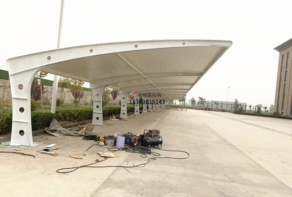 • 環(huán)保節(jié)能:膜結(jié)構(gòu)材料通??梢曰厥绽茫暇G色建筑的理念。同時(shí),雨棚的設(shè)計(jì)使得車棚內(nèi)的照明需求較低,可以減少能耗。部分膜材料還具有高透光率和良好的熱反射性能,進(jìn)一步提高了雨棚的節(jié)能效果。