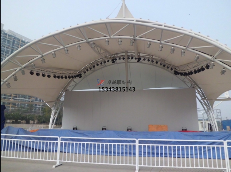 1、具有特定功用的修建都可經(jīng)過立意得以表達(dá),舞臺膜結(jié)構(gòu)的共同外形表現(xiàn)了修建自身的天然美感。
