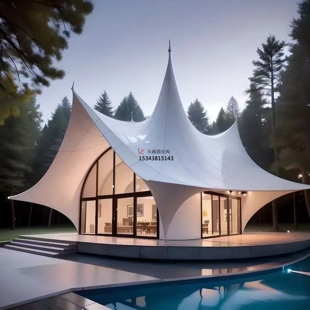 比如在膜結構遮陽廊道下,光影隨時間流轉而變幻,行人漫步其間,仿若置身藝術殿堂。夜幕降臨,景觀照明開啟,膜結構又展現(xiàn)出別樣光影畫卷。內(nèi)部燈光透射使膜結構仿若發(fā)光燈籠,柔和光線暈染周邊,營造溫馨浪漫氛圍;外部燈光投射則借助膜材反射折射特性,在膜面形成絢麗光影圖案,如星空、花朵等,為夜景增添神秘奇幻色彩。