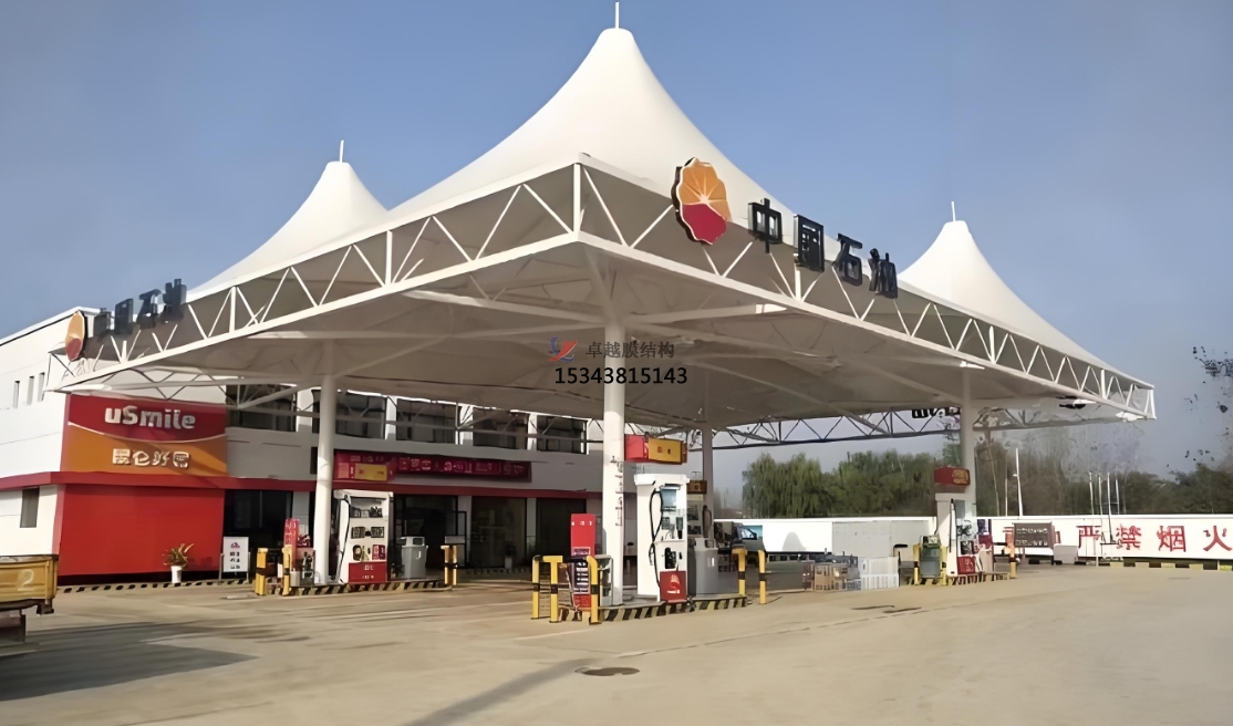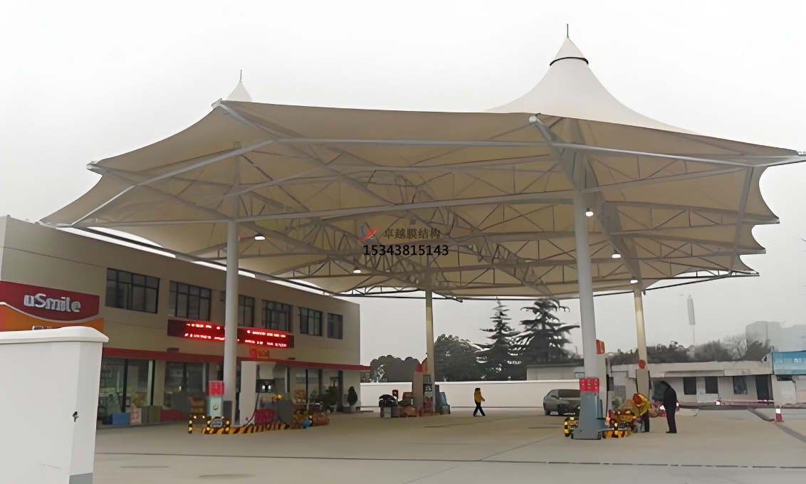 2. 抗風防震:膜結構頂棚設計科學,可承受高達每平方米2000千克的均布荷載,抗風等級達到10級,同時具備良好的抗震性能,確保加油站即使在極端天氣條件下也能安全穩(wěn)定運行。