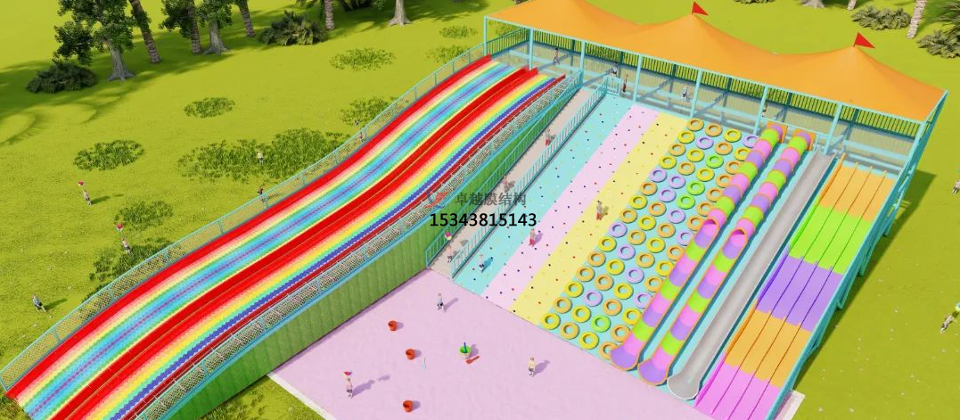 在張拉膜頂下方安裝彩虹滑道,滑道長度可根據(jù)客戶要求定制,一般可達120米。滑道采用防滑、耐磨的材料,保證游客的安全。