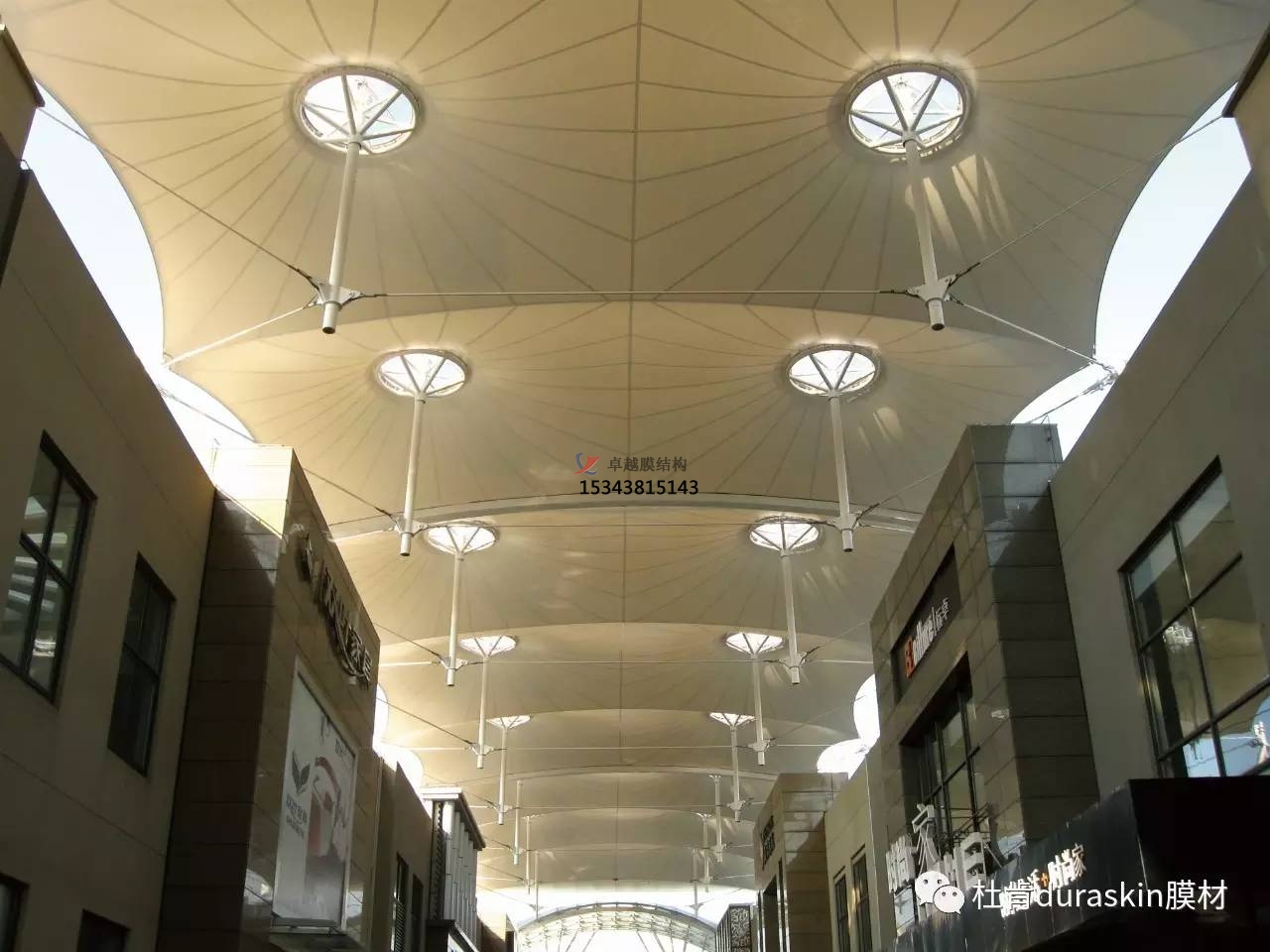 建筑入口使城市公共空間與建筑空間相鄰的界面,成為城市空間的組成部分。它是人們視覺(jué)最先接觸的部分,因此,除了功能以外,還應(yīng)有很強(qiáng)的標(biāo)識(shí)性,并能體現(xiàn)建筑的個(gè)性,是建筑環(huán)境和城市景觀的重要組成部分。由于膜結(jié)構(gòu)自然的曲線美是其他結(jié)構(gòu)類型無(wú)法比擬的,故成為近來(lái)建筑入口及屋頂經(jīng)常采用的形式。