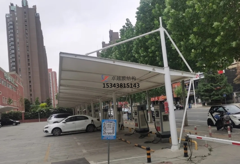 膜結(jié)構(gòu)小轎車充電樁停車棚雨棚是最近幾年才流行起來的,因?yàn)殡妱有∞I車有大型的充電樁,為了充電的安全,就有了膜結(jié)構(gòu)小轎車充電樁停車棚雨棚。