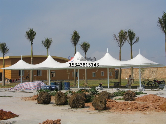 某看臺(tái)工程采用張拉膜景觀,形式新穎、活潑。鋼架與索和膜合理結(jié)合,膜頂平滑過(guò)渡,結(jié)構(gòu)美觀、輕巧、整體造型相互輝映,自具一格。以下介紹的是該張拉膜景觀工程的設(shè)計(jì)步驟及準(zhǔn)則,為以后工程的設(shè)計(jì)提供了參考。