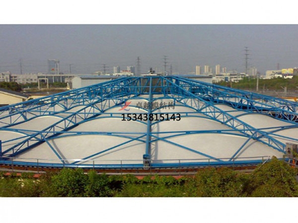 索膜結(jié)構(gòu)污水池結(jié)構(gòu)形式:其結(jié)構(gòu)形式有反吊膜結(jié)構(gòu)、懸索結(jié)構(gòu)和充氣膜結(jié)構(gòu)(無(wú)骨架式)三種。其中,反吊膜結(jié)構(gòu)的原理是以外部鋼構(gòu)為支撐骨架,將抗腐蝕性強(qiáng)的膜材(如氟碳纖維膜)反吊覆蓋于污水池上方,使膜材與腐蝕性氣體隔離,保護(hù)鋼構(gòu)不受侵蝕,適用于造紙廠、化工廠、市政污水處理廠等腐蝕性環(huán)境;懸索結(jié)構(gòu)的特點(diǎn)是利用柔性拉索調(diào)節(jié)膜面張力,無(wú)需內(nèi)部骨架,材料用量少且工期短,局限性是其僅適用于特定跨度的池體,靈活性較低;充氣膜結(jié)構(gòu)(無(wú)骨架式)的工作原理是通過(guò)內(nèi)部空氣壓力支撐膜面,形成大跨度無(wú)立柱空間,適用于超大池體(如200米以上跨度),優(yōu)勢(shì)是可增設(shè)門(mén)窗,便于設(shè)備檢修。