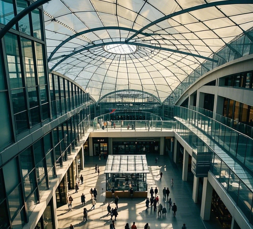 在大型商業(yè)廣場(chǎng)的廊道或大廳頂部,常能見到膜結(jié)構(gòu)穹頂與天幕的身影。以往,實(shí)現(xiàn)自然采光多依賴陽(yáng)光板或鋼化玻璃,然而陽(yáng)光板易老化,鋼化玻璃自重過(guò)大且存在安全隱患。膜結(jié)構(gòu)的出現(xiàn)改變了這一局面,PTFE 及 ETFE 膜材透光性佳、自重輕、安全性高,尤其是 ETFE,其高自潔、高透光特性,讓穹頂天幕在白天引入充足自然光線,節(jié)省照明能耗,夜晚在燈光映照下,又營(yíng)造出如夢(mèng)如幻的氛圍,為顧客帶來(lái)獨(dú)特的購(gòu)物體驗(yàn)。