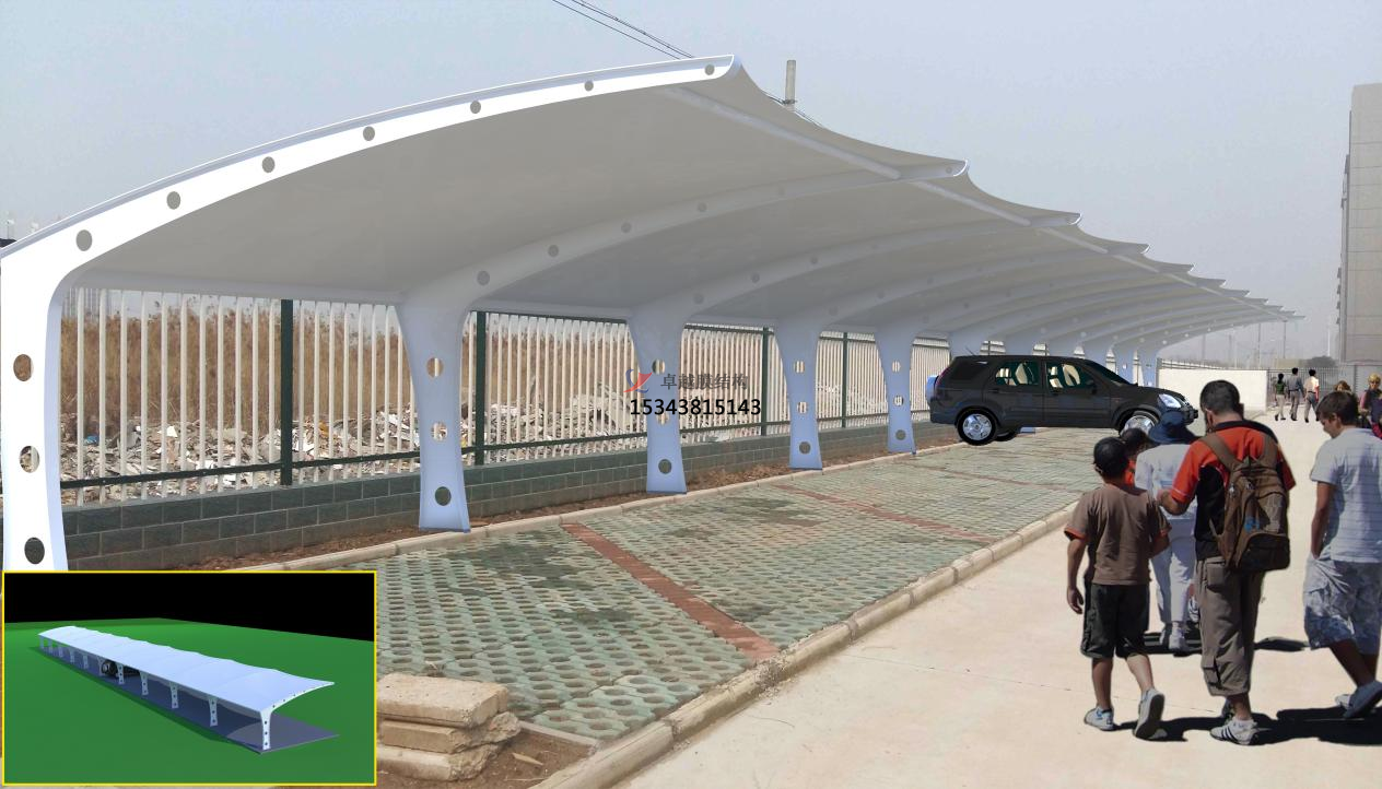 膜結(jié)構(gòu)停車棚一般都是采用反射隔熱的材料. 采用專業(yè)生產(chǎn)的膜結(jié)構(gòu)這樣骨架構(gòu)成.能夠?qū)⑵?、自行車等車全部覆蓋,從根本上解決遮陽遮雨的問題.不僅能將90%的紫外線和紅外線等熱源阻止.還能防止光對(duì)車體的傷害.特別是在炎熱的夏季能夠保證車內(nèi)的溫度不會(huì)太高,從而降低了車體受到外界的污染;這樣也就延長了車的使用壽命。