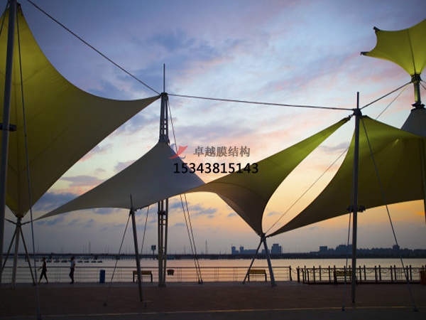 一個城市的中心區(qū)反映一個城市的地理風(fēng)貌和民族風(fēng)情,同時,也是一個城市文化發(fā)展程度的標(biāo)志。而景觀設(shè)計要求其具有廣泛的可讀性、雅俗共賞,既有超凡脫俗的藝術(shù)價值,又能使大眾喜聞樂見與大眾息息相通。膜結(jié)構(gòu)以其輕盈飄逸的造型、柔美并帶有力量的曲線和大跨度和大空間的鮮明個性和標(biāo)識性,應(yīng)用于城市小品設(shè)計中。
